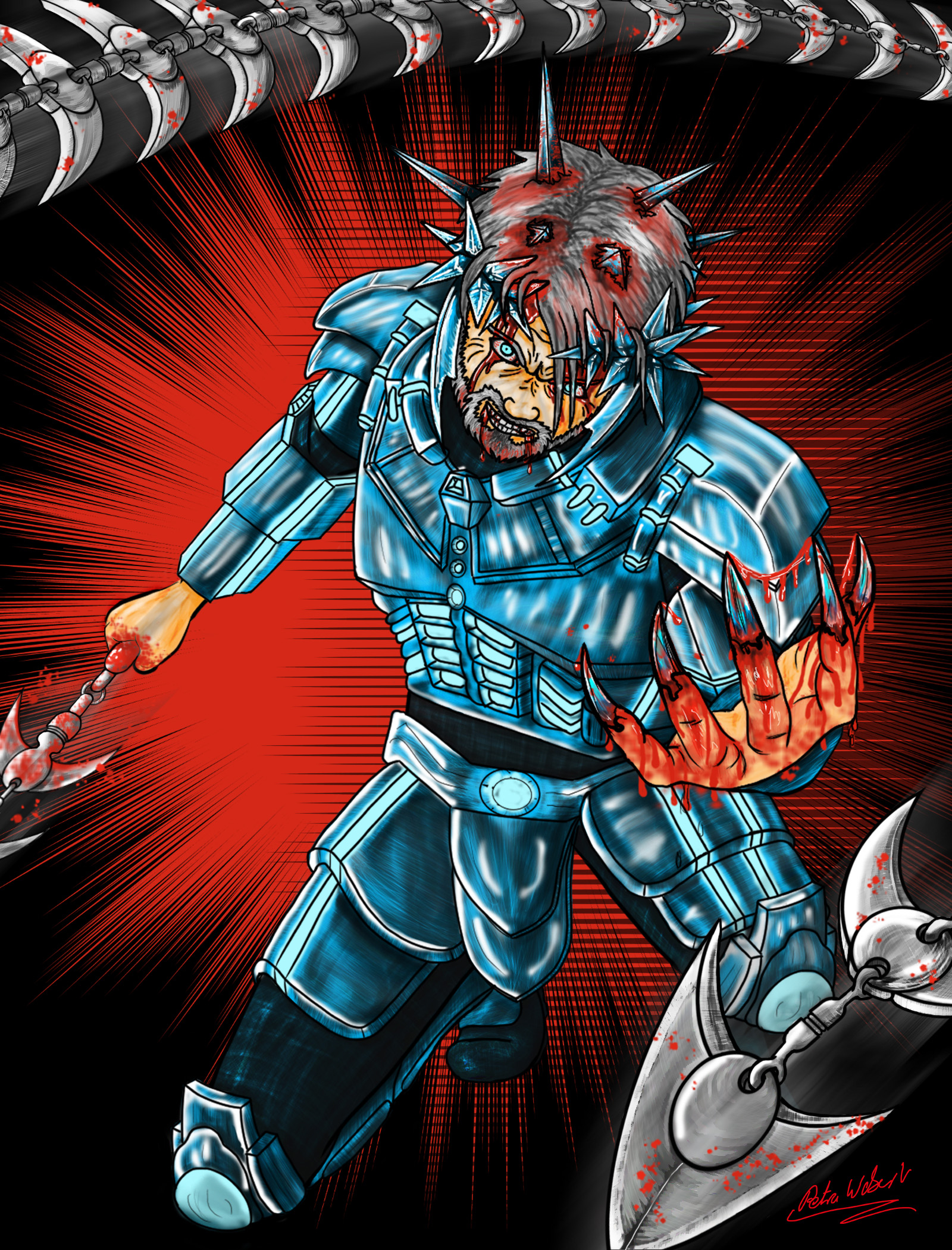 Dieses Metall befindet sich überall im Körper. Das Blut ist um 50% mehr mit Eisen angereichert wie bei Menschen üblich. Die Arm- und Beinknochen sowie die Hand- und Fußknochen als auch die Rippen sind wie bei Spulen mit Drähten umwickelt. Im Knochengewebe befindet sich zudem flüssiges Metall und in Organen und Muskeln Ablagerungen, Splitter und Späne.